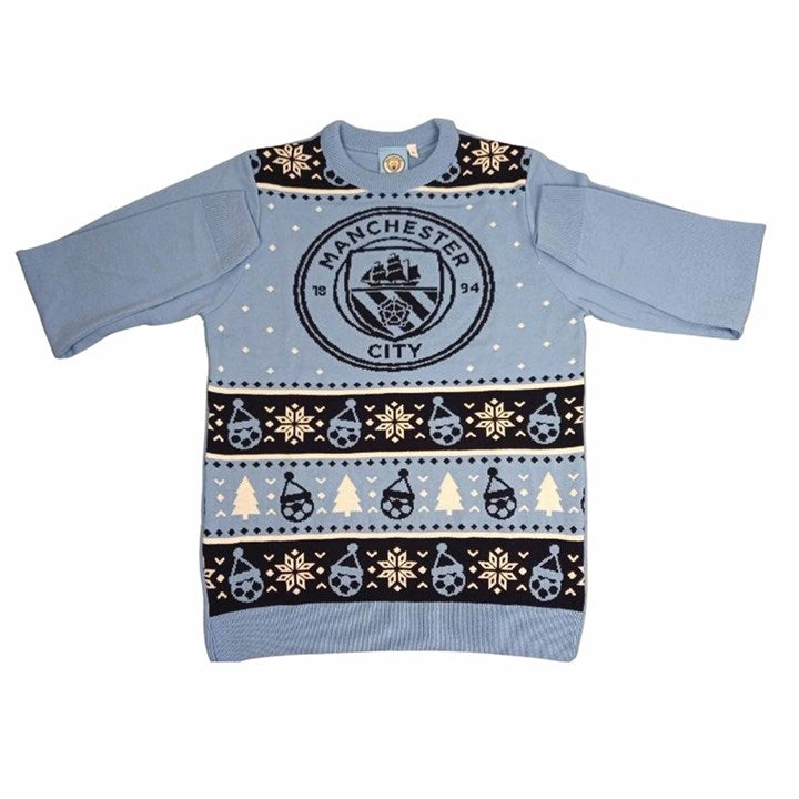 Deck the halls in football style with the official Manchester City Christmas Sweater, a must-have holiday accessory for any die-hard fan of the Blues. This fashionable Christmas sweater, bearing the iconic Manchester City FC logo, adds a festive twist to your football fandom and helps you stand out in the crowd.